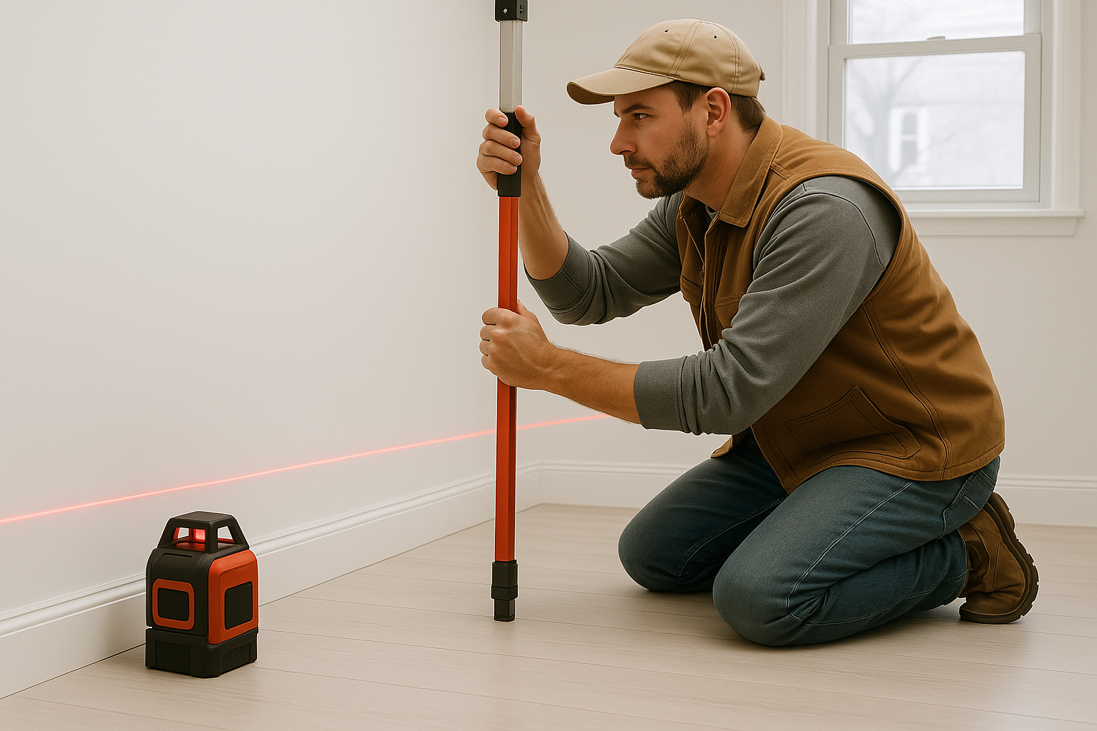 We use a tripod-mounted laser to identify the highest point in the room. All framing will match that reference height — no guessing.